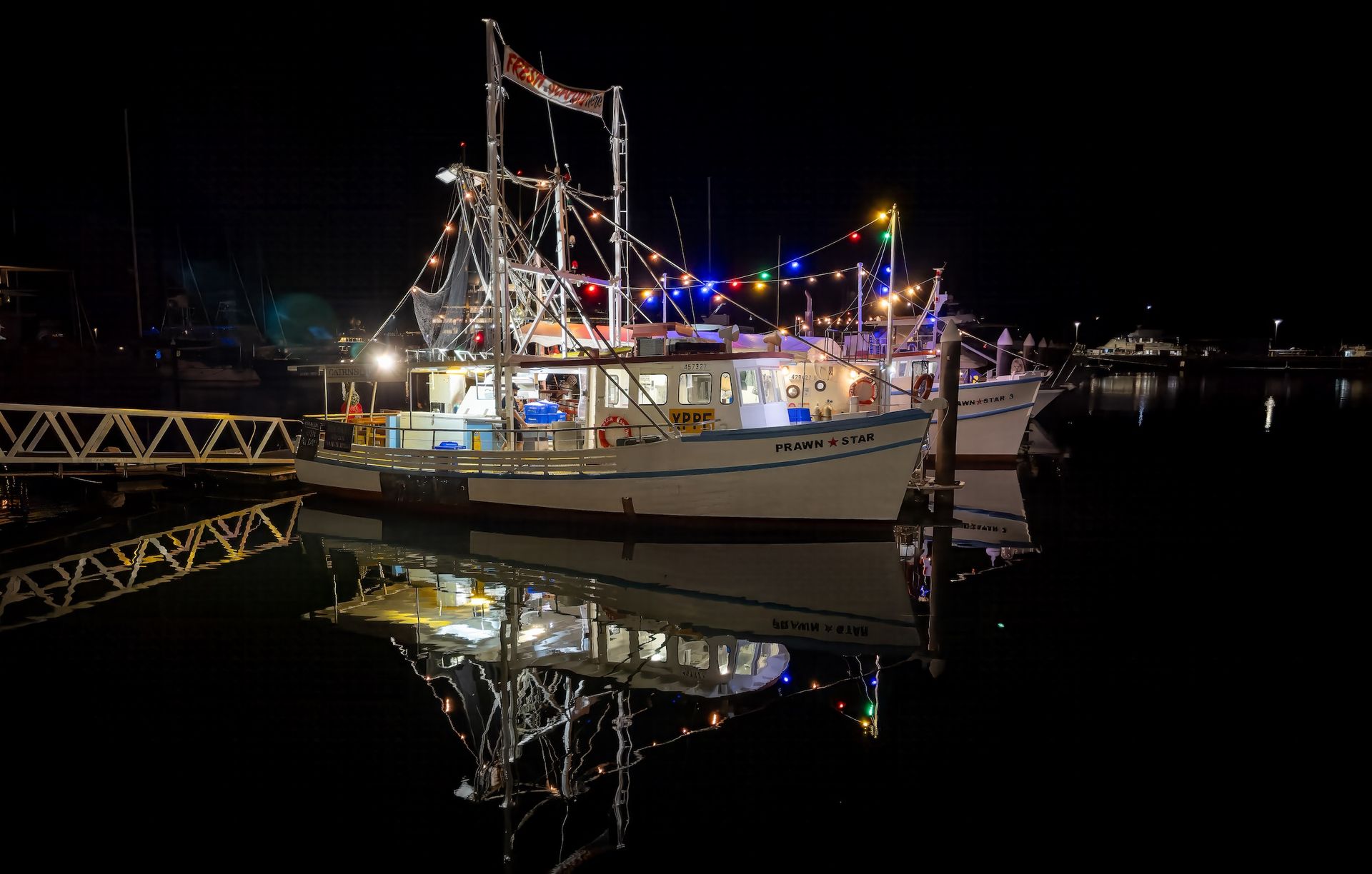Pelicans glide across the water while fishing boats head out toward the Great Barrier Reef.